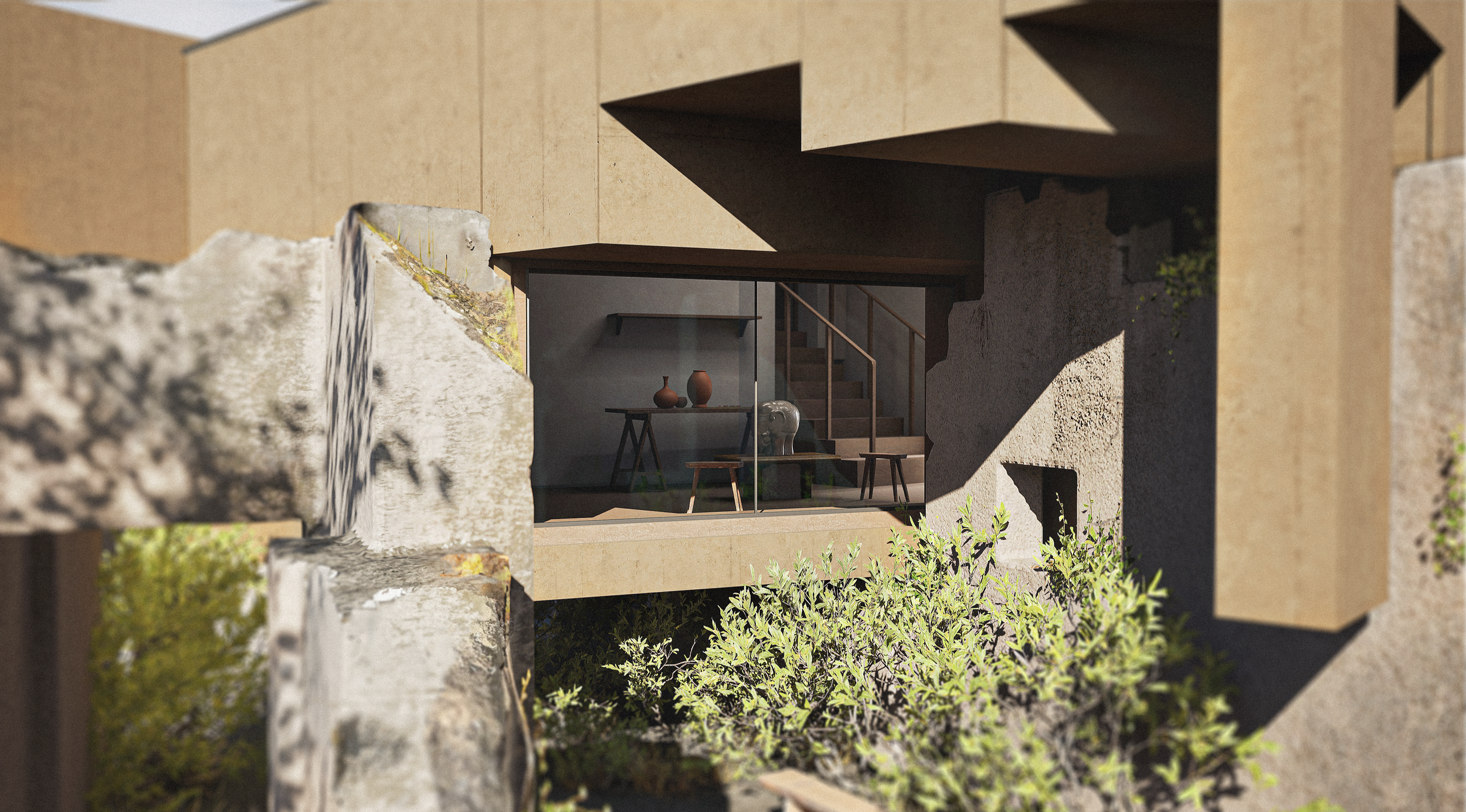 Selective demolition creates a “ruined silhouette,” fostering a dialogue between the old and new. Weathered fragments act as anchors for minimalist prefabricated cross-laminated timber (CLT) additions. These temporary prefabricated volumes are placed down upon the existing walls and masonry, creating a striking juxtaposition between the clean, rectilinear forms of mass timber and the rugged, layered remnants of the site. These adaptable structures, designed to last from a few months to a few years, serve as popup galleries or shops, offering flexible spaces for community and artistic engagement. These CLT volumes are placed down on the site in a seemingly ad-hoc fashion, while being meticulously precise in their design. They can take on whatever shape, size, or orientation anywhere they can rest on existing structures depending on the needs of the community.